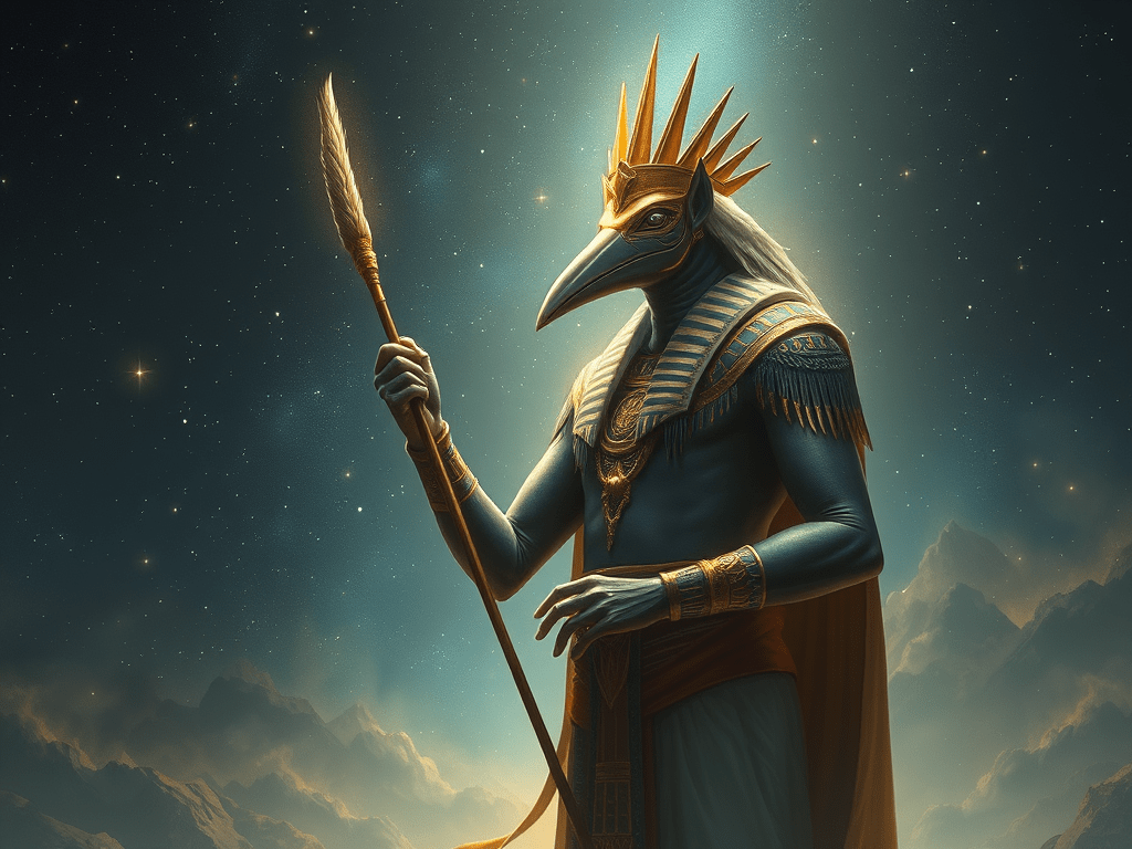 Imagine une nuit étoilée, calme et mystique. Le ciel, vaste comme l’éternité, brille de mille secrets. Thot, ou Djehouty en égyptien ancien, dieu à tête d’ibis ou parfois à visage de babouin, se tient là, au croisement des mondes, un roseau à la main. Il écrit, trace les lignes de l’univers et garde la mémoire du cosmos.